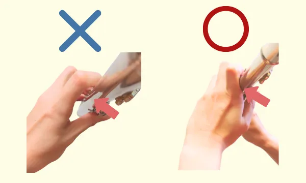 ・親指→人差し指の真下より少し後ろあたりで楽器を支えます。