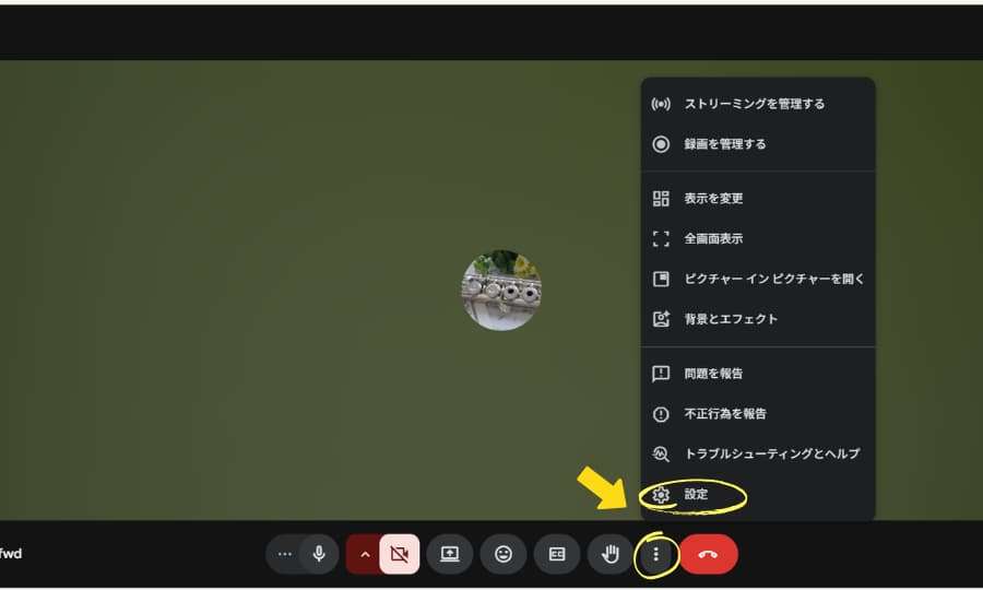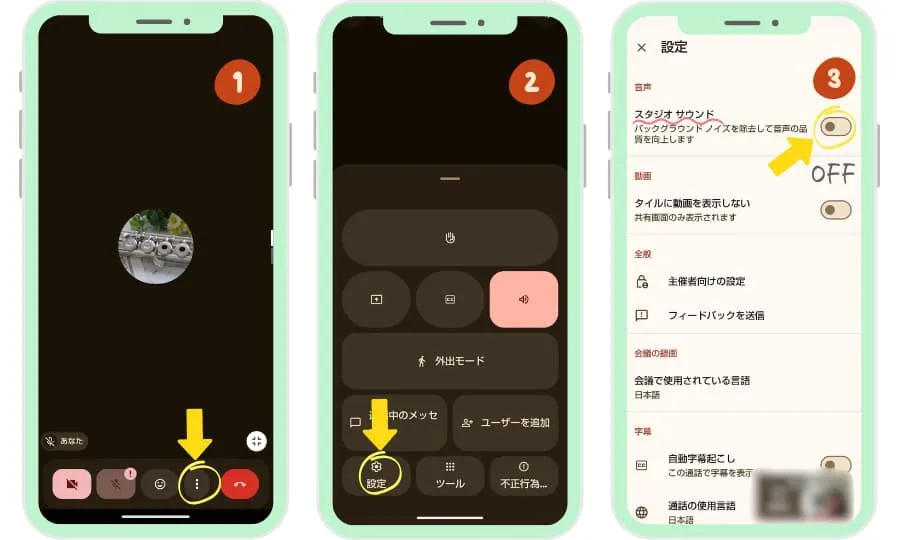 Google Meetには、周囲の雑音を消す「ノイズ除去」機能があります。 フルートの音まで雑音と判断されて消えてしまうのを防ぐため、レッスン開始後に以下の設定をお願いしています。