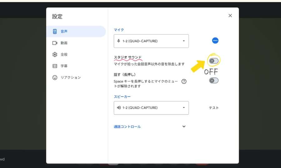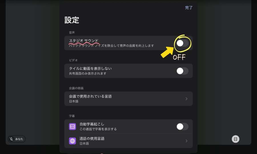 3.「スタジオサウンド(またはノイズ除去)」をオフにする